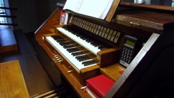 | Spielhilfen, Koppeln: | II/I, II/I (Sub), II/I (Super), I/P, II/P, Piano, Forte, Tutti, Alles Ab, Automatisches Pianopedal für II |