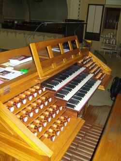| Spielhilfen, Koppeln: | II/I, III/I, III/II, I/P, II/P, III/P, I 4', II/I 16', II 4', III 4', III 16'. Piano, Mezzoforte, Forte, Fortissimo, Tutti. Komb. 1 und 2. Rollschweller. Handregister ab. Zungen ab. Schwelltritte für II, III manual und Fernwerk |