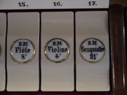 (*) 4 Register wurden später neobarockisierend verändert, darunter drei 8'-Register (ersichtlich aus der originalen Reihenfolge am Spieltisch).