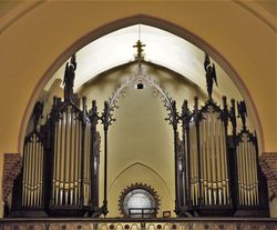 | Umbauten: | Am 14.06.1917 mußten die Zinn-Prospektpfeifen zu Kriegszwecken abgeliefert werden, sie wurden später durch Zinkpfeifen ersetzt.
