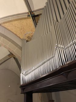 | Umbauten: | 1960 fand eine leichte Umdisponierung statt, bei der unter anderem auch die Hauptwerksmixtur umgearbeitet und das Cornett im Schwellwerk von 3 auf 2 Chöre reduziert wurde. Darüber hinaus wurde die Aeoline 8' durch eine Zartflöte 4' sowie die Vox coelestis 8' durch eine Quinte 11/3' ersetzt.