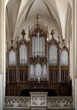 Die große Orgel auf der Westempore wurde im Jahre 1911 von dem Orgelbauer Matthäus Mauracher jun. (Salzburg) erbaut. Wiederverwendet wurde in diesem Instrument Pfeifenmaterial aus den Vorgängerorgeln, sowie der Barockorgel, die auf der ehemaligen Musiker-Empore im Chorraum der Kirche stand. Der neugotische Prospekt stammt in großen Teilen von der Vorgängerorgel, die von Friedrich Deutschmann erbaut worden war. Das spätromantisch disponierte Kegelladen-Instrument hat 36 Register auf zwei Manualen und Pedal. Die Spiel- und Registertrakturen sind pneumatisch.