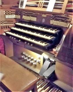 | Umbauten: | In den 1960er Jahren wurde das ursprüngliche Rückpositiv (III) von der Emporenbrüstung zwischen die beiden Hauptorgelteile, unterhalb des Fensters versetzt |