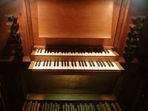 | Spielhilfen, Koppeln: | Manualkoppel, Hauptwerk-Pedal |