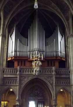Prinzipal 8' Flûte harmonique 8' Holzgedackt 8' Salicional 8' Geigenschwebung 8' Oktave 4' Flûte traversière 4' Spitzgambe 4' Nazard 22/3' Doublette 2' Gemshorn 2' Tierce 13/5' Septime 11/3' Fourniture II 22/3' Mixtur V 11/3' Glockenzimbel III 1/3' Basson 16' Trompette harmonique 8' Hautbois 8' Clairon 4' Tremulant |