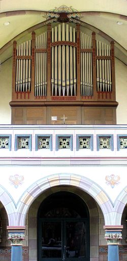 | Gehäuse: | 1996 wurde die Hock-Orgel durch die heutige Mayer-Orgel ersetzt. Dabei wurde das Gehäuse wiederverwendet. |