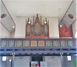 | Geschichte der Orgel: | Die Orgel wurde 1974 durch Sebald umgebaut und dabei die Registertraktur elektropneumatifiziert. Es wurde ein neuer einmanualiger freistehender Spieltisch und entsprechende Aluminium-Traktur gebaut. Um mehr Platz auf der Empore zu schaffen, wurde die ursprünglich seitspielige Orgel nach hinten versetzt und das Pedalwerk rechts in einer Nische untergebracht. |