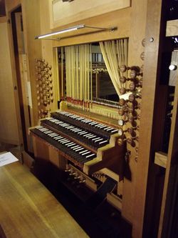 | Gehäuse: | Eiche massiv. Um eine schlanke Gehäuseform zu ermöglichen, wurde auf eine tragende Holzkonstruktion verzichtet. Die Laden des Pedals und des Hauptwerks ruhen deshalb auf einer Stahlkonstruktion. |