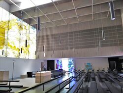 Blick zur durchlässigen linken Seitenwand der Kirche hinter der sich die Empore und die Orgel verbergen