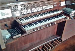 | Spielhilfen, Koppeln: | II/I, I/P, II/P, 2 freie Kombinationen, Tutti, Zungeneinzelabsteller |