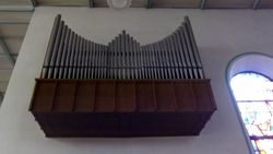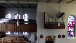 | Umbauten: | 1973 Versetzung des Positivs von der hinteren Empore an die Südwand des Kirchenschiffes durch OBM Herbert Schmidt, Mersch (Lux.), verbunden mit einer Ausreinigung der gesamten Orgel. Derselbe Orgelbauer behob 1977 einen Wasserschaden, der durch Einbringen von Flüssigkeit in die Pfeifenbohrungen der Prospektlade am Hauptgehäuse offenbar vorsätzlich verursacht worden war. |