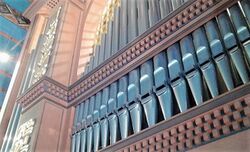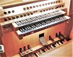 | Spielhilfen, Koppeln: | Koppeln II/I, I/P, II/P; Setzeranlage, Tutti, Zimbelstern |