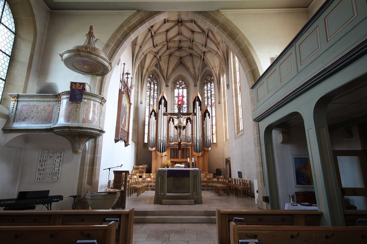 | Beschreibung | Altar der Ev. Stephanuskirche zu Leinfelden-Echterdingen/Echterdingen mit Chorraum und Weigle-Orgel und Kanzel |