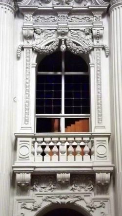 | Spielhilfen, Koppeln: | Koppeln: II-I, I-P, II-P. Eigener zweimanualiger Spieltisch. Vom IV. und V. Manual des Hauptspieltisches spielbar. |