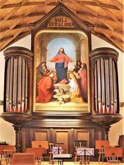 Gehäuse: Eine Besonderheit des Gehäuses ist das in den Prospekt integrierte Gemälde von Cesare Mussini, welches (in Bezug auf den ursprünglichen Aufstellungsort der Röver-Orgel) den Leiden lindernden und heilenden Christus zeigt.