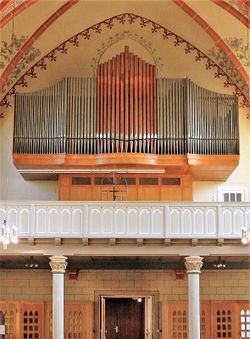 | Spielhilfen, Koppeln: | II/I, II/I (Sub), I/P, II/P, 2 freie Kombinationen, Tutti, Zungen Ab, 16' Ab, Crescendotritt |
