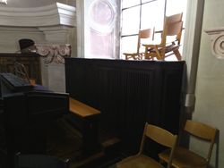 | Gehäuse: | Die Manualwerke stehen im Hauptgehäuse an der Brüstung und werden hinterspielig angesteuert. Die Pedalpfeifen sind liegend in einem eigenen Kasten hinter der Orgelbank untergebracht. |