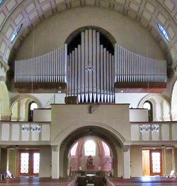 | Spielhilfen, Koppeln: | II/I, III/I, III/II, I/P, II/P, III/P, 2 freie Kombinationen, Piano, Mezzoforte, Forte, Tutti, Zungen Ab |
