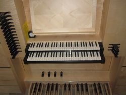 Viola da Gamba (I/II) 8' Traverse (I/II) 8' Gedackt (I/P) 8' [3] Quintatön (I/II) 8' Octav (I/II) 4' Hohlflöte (I/II) 4' Nasat (I/II) 22/3‘ Octav (I/II) 2' Flöte (I/II) 2' Terz (I/II) 13/5‘ Mixtur (I 4f/I 3f)[4][5] 11/3' Trompete (II/P) 8' ‘‘Tremulant‘‘ |