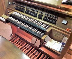 | Spielhilfen, Koppeln: | II/I, I/P, II/P, 2 freie Kombinationen, Pleno, Tutti, Zungeneinzelabsteller, Registerschweller |