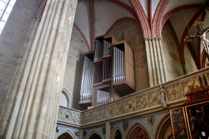 Geschichte der Orgel: Nachfolgeinstrument der auf der Westempore aufgestellten Orgeln von Christoph Donat (1665 erbaut, 1870 nach England verkauft) und Richard Kreutzbach (1870-1910, III+P/44) sowie einer spätromantischen Jehmlich-Orgel von 1910/12 (z.T. mit alten Stimmen), die wie die heutige Orgel auf der nördlichen Lettnerempore stand