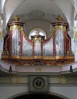 | Geschichte der Orgel: | 1806 baut Frosch nach den Plänen des Abbé Vogler eine Orgel nach dem von ihm erfundenen Simplifikationssystem. Demnach werden aus einigen extendierten Grundreihen durch Bass-/Diskantteilung und Mehrfach-Transmissionen sehr viele Register gewonnen. Dies ist der Vorläufer der modernen Multiplexorgel. Da außer Vogler selbst jedoch im Prinzip niemand die komplizierte Anlage der Orgel zufriedenstellend bedienen kann, wird sie zwischenzeitlich wieder in eine „normale Orgel“ umgebaut, danach aber nochmals in den Vogler'schen Zustand versetzt. 1910 wird anlässlich der großen Kirchenrenovierung ein monumentaler Neubau durch die Firma Maerz (Inh. Albert Schönle) verwirklicht. |
