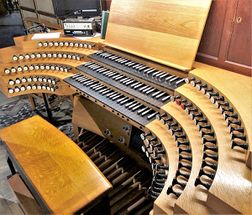 Spieltisch der Hauptorgel (seit 1993). Fest an das Südostwerk angebaut.