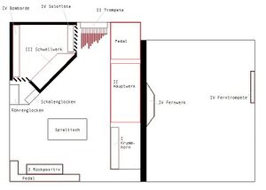 - ↑ 1,0 1,1 Extension aus Krummhorn 8'. Das Rankett 16' klingt erst ab c0