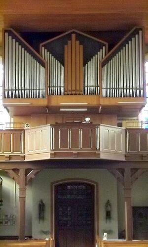 Pommer 16' Prinzipal 8' Flöte 8' Gemshorn 8' Oktave 4' Rohrflöte 4' Rohrnazard 22/3' Oktave 2' Mixtur 5f Trompete 8' |