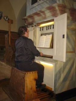 Gambe 8‘ Principal 4‘ Fletn 4‘ Quinte 2 2/3‘ Octav 2‘ Mixtur 2 fach 2‘ rep. c‘ /1 1/3‘ |