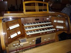 | Spielhilfen, Koppeln: | II/I, III/I, III/II, I/P, II/P, III/P, 2 freie Kombinationen, Setzer, Sequenzer Vor/Zurück, Crescendowalze, Walze Ein/Aus, Tutti |