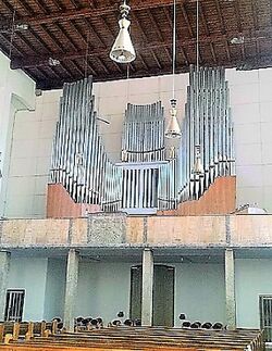 | Geschichte der Orgel: | Die Orgel wurde zunächst nur als Teilausbau mit 19 Registern durch Zeilhuber realisiert. Während Prospekt, und die komplette Technik bereits 1961 fertiggestellt waren, wurden seinerzeit -wohl vermutlich aus finanziellen Gründen- nur 19 Register in Haupt, Schwell- und Pedalwerk eingebaut. 1982 dann baute Michael Weise die fehlenden Register ein und erweitere die Disposition somit auf die heutigen 43 Register. |