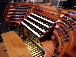 Bemerkung: Die Orgel besitzt zwei optisch baugleiche Spieltische. Einen Elektrischen auf der unteren Empore, der aus praktischen Gründen in der Regel für die Liturgie und Konzerte genutzt wird. Für Organisten, die eine mechanische Spieltraktur bevorzugen, existiert ein zweiter, mechanischer Spieltisch an der klassischen Position zwischen Rückpositiv und Hauptwerk.