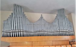 Bemerkung: Einige Register der Orgel sind nach wie vor vakant. Das wären im Hauptwerk: Nasat 22/3' und Trompete 8'; Im Positiv das Trichterregal 8', sowie im Pedal: Zartbass 16', Gedacktbass 8', Flachflöte 2' und Posaune 16'.