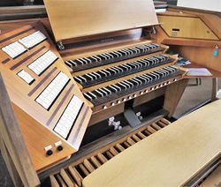 Spielhilfen, Koppeln: I/II, III/II, I/P, II/P, III/P; Setzeranlage mit 10.000 Kombinationen in Sequenzschaltung