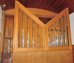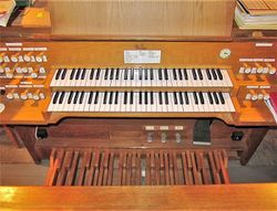 | Umbauten: | Disposition (II+P/12) entworfen von Herbert Schulze und Dr. Karl Theodor Kühn (beide Berlin), vgl. Berlin/Steglitz, Markuskirche, Berlin/Westend,_Epiphanienkirche, Berlin/Staaken, Gartenstadt-Kirche, Berlin/Steglitz, Patmos-Kirche.