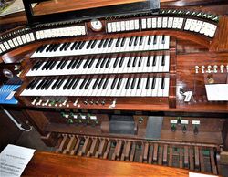 | Spielhilfen, Koppeln: | II/I, III/I, III/II, I/P, II/P, III/P, 2 freie Kombinationen (je als Fuß- und Handschalter), Registerrad, Tutti; seit 2016: elektronische Setzeranlage (10.000 Kombinationen) |