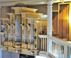 | Anmerkungen: | Das Pedalwerk ist seitlich hinter dem historischen Gehäuse in zwei separaten Teilwerken angeordnet. |