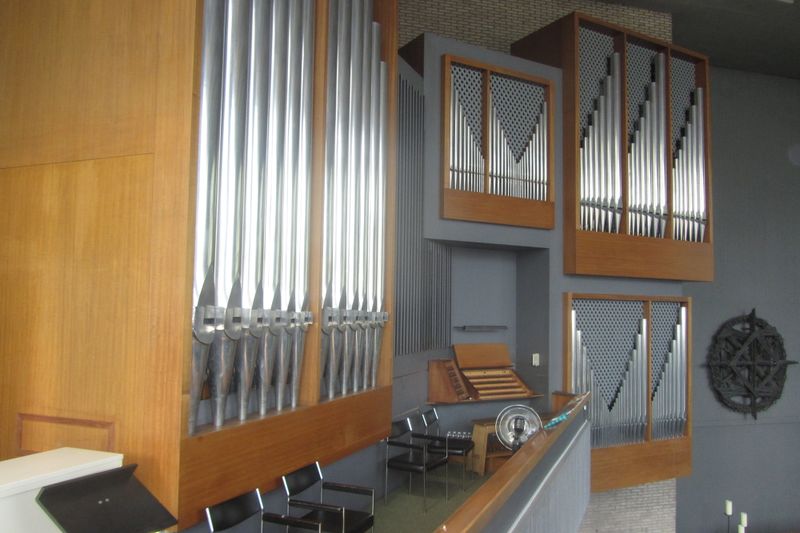 Düsseldorf - Düsseltal, Melanchtonkirche, K. Schuke, 1967, Ansicht von der Empore aus: von vorne nach hinten: Pedalwerk, Schwellwerk (III), Spieltisch, darüber Kronwerk (IV), rechts oben Hauptwerk (II), darunter Solowerk (I)