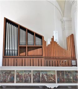 | Spielhilfen, Koppeln: | II/I, II/I (Super), II/II (Super), I/P, II/P, 1 freie Kombination, Automatisches Pianopedal, Tutti, Registercrescendotritt, Zungeneinzelabsteller, Zungen Ab |