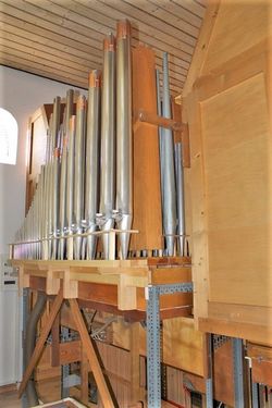 | Umbauten: | 2011/12 Umsetzung nach Großkrotzenburg und Erweiterung um drei Register durch Raab & Plenz: Im Hauptwerk wurde eine neue elektrische Zusatzlade eigerichtet, auf der der ehemalige Offenbass 8' nun auch als Prinzipal 8' im Hauptwerk spielbar ist. Auf dem so frei gewordenen Registerstock im Pedal wurde ein neues Fagott 16' eingebaut. Zudem wurde im Oberwerk ein neuer Salicional 8' ergänzt. |