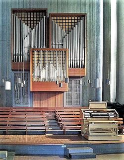 | Umbauten: | 2010 Umdisponierung, Erweiterung um zwei Pfeifenreihen und neuer Spieltisch durch die Firma Klais. Ein drittes Manualwerk bestehend aus zwei Multiplex-Pfeifenreihen wurde ergänzt. Einige aus diesen Multiplexreihen gezogene Register sind auch als Transmissionen im Pedal spielbar. In diesem Zuge wurde auch eine Lichtinstallation an der Orgel angebracht. |