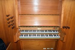 | Umbauten: | Generalüberholung 2004 durch Martin Vier: Ausreinigung und Aufarbeitung/Richtung der Pfeifen; Regulierung und Ertüchtigung der Spieltraktur; Neuintonation (insbesondere Abschwächung Prinzipal 4'); Stimmung in historisierender, ungleichschwebender Temperierung. |