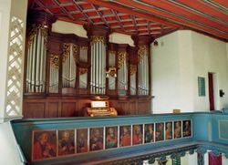 | Umbauten: | Die Orgel wurde mindestens einmal umgestaltet und barockisiert, was sich am Aufbau der Disposition und an der Anordnung der Registerwippen erkennen lässt. In der Dispositionstabelle werden die Register wie am Spieltisch angeordnet wiedergegeben, dadurch wird erkenntlich, welche Register verändert worden sein müssen.