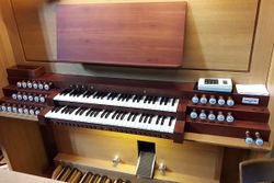 | Spielhilfen, Koppeln: | II/I, III/I, III/II, I/P, II/P, III/P, 3 freie Kombinationen, Tutti, Automatisches Pianopedal, Zungen Ab, Zungeneinzelabsteller |