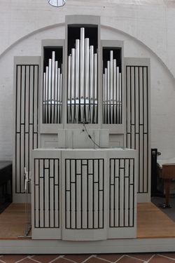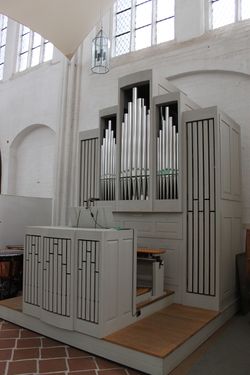 | Geschichte der Orgel: | Erst 1987 wurde die Kirche nach der Zerstörung im 2. Weltkrieg wieder aufgebaut. Sie wird seitdem als Kunst- und Kulturkirche genutzt. 1992 erhielt sie wieder eine Orgel, gestiftet von der Sparkasse zu Lübeck anlässlich ihres 175-jährigen Bestehens und von der Prof. Dr. Julius Edelhoff-Stiftung. Das Instrument mit 2 Manualen, Pedal und 19 Registern befindet sich als Chororgel im nördlichen Seitenschiff. Als Besonderheit ist anzumerken, dass der Spieltisch in das Positiv eingefügt ist. Der Organist sitzt vor dem Hauptwerk und blickt über das Positiv zum Dirigenten bzw. zur Gemeinde. |