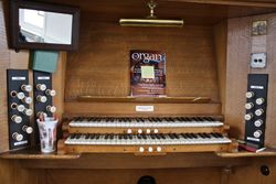 | Spielhilfen, Koppeln: | Koppeln: Swell to Pedal, Swell to Great, Great to Pedal, Swell Octave, Swell Suboctave; jeweils drei "divisional pistons" für beide Manuale; Schwelltritt |