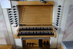 | Spielhilfen, Koppeln: | II/I, II/P, I/P, Plenum An/Ab, Zungenabsteller |