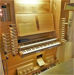 | Spielhilfen, Koppeln: | II/I, II/II (Sub), I/P, II/P, Setzeranlage, Klangspiel (Zimbelstern) |