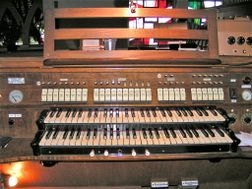 | Spielhilfen, Koppeln: | II/I, I/I (Super), II/I (Sub), II/I (Super), I/P, II/P, 1 freie Kombination, Tutti, Crescendowalze, Einstellbares Automatisches Pedal |